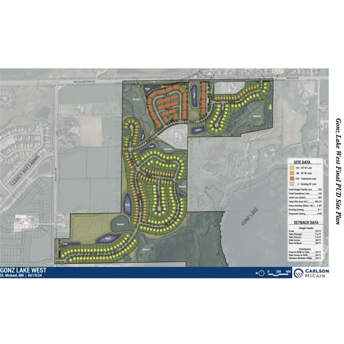 Gonz Lake West is located less than two miles from downtown St. Michael, MN and is situated on the western shore of Gonz Lake. The neighborhood features open, natural areas throughout and views of wetlands, streams, and the Gonz Lake shoreline. Significant acreage was donated to St. Michael for a regional park on the west side of the development. Future phases will include parkland dedication of a ten-acre island parcel that will be connected with a trail system. Lennar is the builder for the neighborhood.