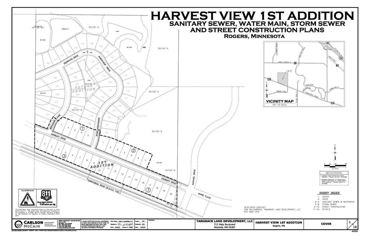 Harvest View is a 45-acre project in Rogers, MN. The neighborhood will be developed over two phases. The first phase was constructed in 2022: the entire site was graded and 32 lots for single family homes along Territorial Road were final platted. Phase 2 added 46 lots in the fall of 2023. Harvest View will include a city park with both amenities and trails. DR Horton will offer a variety of home sizes and styles at Harvest View.
