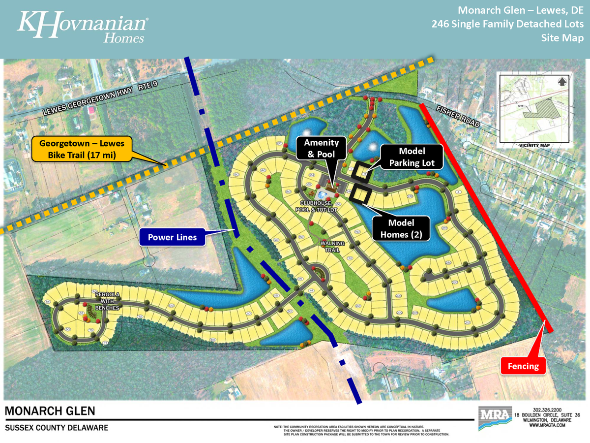 Monarch Glen is Tamarack's first project in the state of Delaware. Located southwest of the intersection of Fisher Road and Route 9 in Lewes, Monarch Glen will be comprised of 246 lots for single-family homes across 125 acres. The neighborhood will feature many amenities, including a clubhouse with pool and tot lot, a walking path, a variety of water features, and pocket park with a pergola and benches. The Georgetown-Lewes Bike Trail, which is the longest bike trail in Delaware, runs along the north side of Monarch Glen. The project began in September 2023 and is a partnership with K Hovnanian Homes.